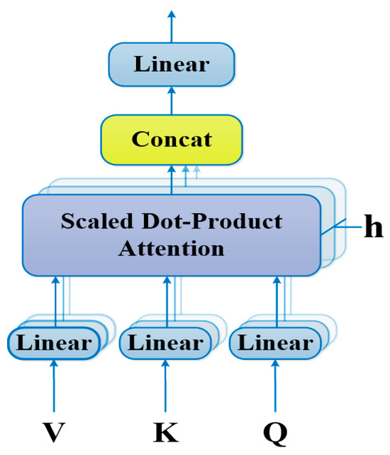 In order to use the Scaled Dot-Product Attention, and must have the same dimension. So in the model, and are mapped into dimension, and is mapped into dimension respectively by h = 8 different linear transformations. Then the above matrix is substituted into the attention mechanism to produce a total of -dimensional output. Then the encoded information from h subspaces is fused and the final output is obtained by a linear transformation.