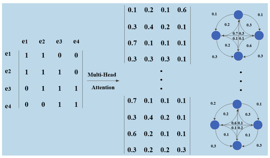To fully consider the relation information between two connected entities, Multi-Head Attention is used in this paper to construct a fully connected edge-weighted graph. The process is shown in Figure 5.