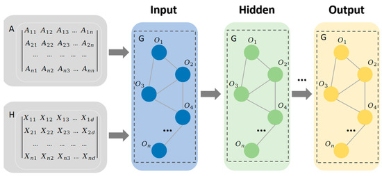 Given a graph with nodes, the nodes in the graph are denoted as to . The input part is the input node embedding matrix and adjacency matrix . represents the number of nodes and represents the embedding dimension of input nodes. Each row of represents the feature vector of the node, and denotes the connection relation between the nodes. means two nodes are connected. In an L-layer GCN, each layer is expressed as a nonlinear function: