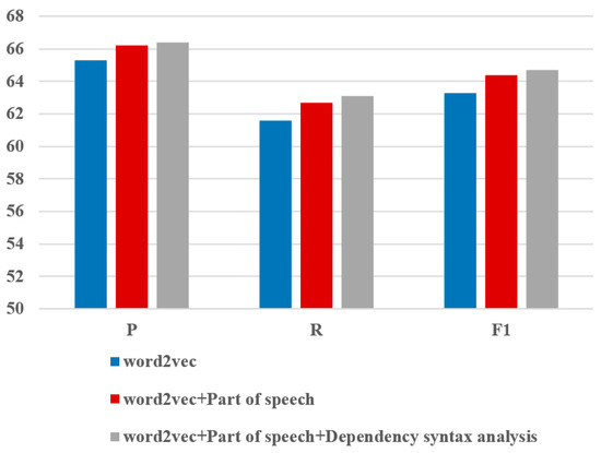 The deep learning method can effectively consider the syntactic structure information of sentences, so it is widely utilized in entity relation extraction tasks. However, the lexical features and semantic information of the two entities in the sentence cannot be well considered simultaneously in the method. Therefore, the part-of-speech features and dependency parsing features are placed into word embedding in this paper. The experimental outcomes are displayed in Table 4 and Figure 11.