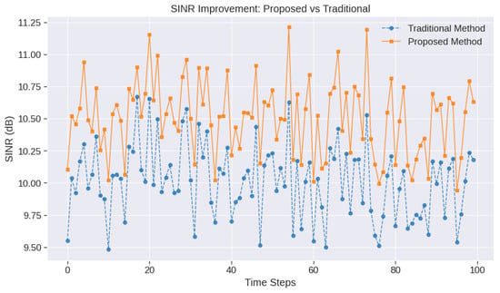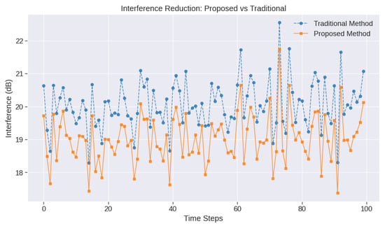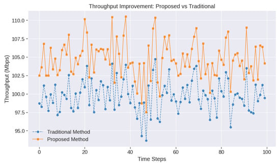Throughput improvement is presented in Figure 6 below. In particular, the proposed method yields higher throughput at each time step than the traditional method. The figures show that the proposed method provides an average of 105–110 Mbps throughputs for managing interference and SINR better than the traditional method, which remains constant at 100 Mbps. The throughput improvement is significant in wireless networks because it increases data transfer rates and better utilizes available resources.