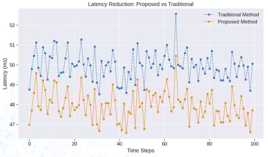 The result of proposed method has been illustrated in Figure 7, which shows the improvement in latency achieved by the method. The proposed method always produces a lower latency than the traditional method. It can be seen from the figure that the proposed method has latency values ranging from 47 ms while the traditional method has latencies above 50 ms. The reduction in latency is proportional to the method’s effectiveness in addressing interference and network resource allocation in real time to reduce delays in data transfer.