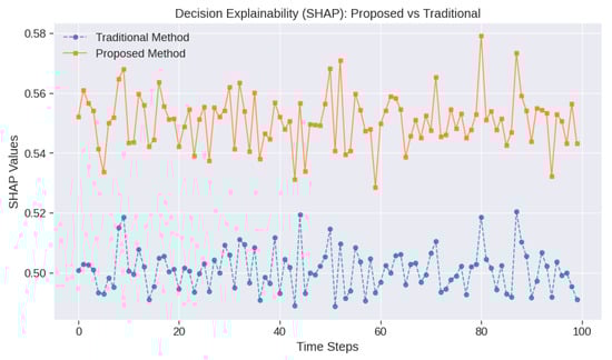 Decision explainability (SHAP values) over time (sec) for traditional vs. proposed methods. The proposed method shows higher SHAP values, providing more explainable and transparent decision-making compared to the traditional approach.