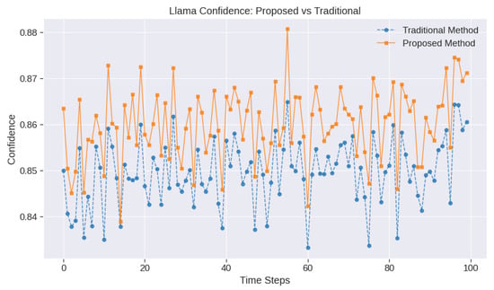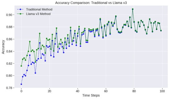 The accuracy comparison between the traditional and Llama v3 methods is shown in Figure 13. The proposed method achieves higher accuracy, stabilizing around 0.89–0.90, while the traditional method fluctuates between 0.83 and 0.85. This increase in accuracy can be attributed to the proposed method’s better handling of interference and power control, which leads to more accurate decision-making across the network.