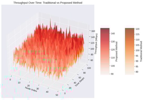 A 3D visualization of throughput over time for traditional vs. proposed methods. The proposed method consistently achieves higher throughput across all nodes, particularly in dense environments, while the traditional method shows significant fluctuations and lower overall throughput.