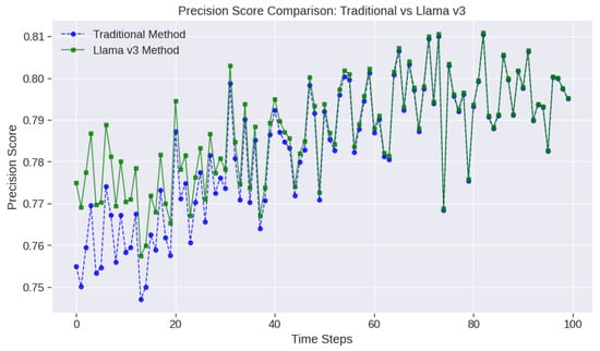 Furthermore, Figure 12 shows the precision score comparison between traditional works and LLM-powered method. The proposed framework shows higher precision values with gradual increase and stabilization at around 0.80, whereas the traditional method shows a precision of 0.78, slightly lower than the proposed method; this metric shows the robustness of the proposed framework.