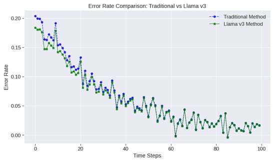 Figure 14, shows the error rate and their comparison between traditional and proposed framework. The proposed framework shows a faster reduction in error rate stabilizing from 0 to 0.02 by 100th time step, whereas the traditional framework balances from 0.03 to 0.05 at the same time step. The rapid decrease in error rate shows Llama’s capability to capture enhanced and complex predictive patterns.