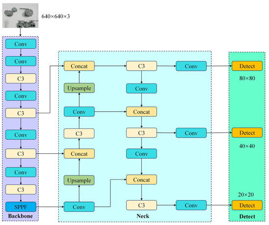 The YOLOv5 model has five different versions while maintaining consistency in network structure: YOLOv5s, YOLOv5m, YOLOv5l, YOLOv5x, and YOLOv5n. The difference between different versions of the model lies in its volume and complexity. YOLOv5n is the lightest model, and YOLOv5x is the largest. The larger the model, the better the detection capability and the higher the accuracy, but at the same time, its detection speed will also be slower and the hardware performance requirements will be higher. The YOLOv5 model provides different trade-offs between speed and accuracy, and can be appropriately selected according to different application scenes and performance requirements. Among them, YOLOv5s is characterized by a smaller volume, fast detection speed, and good performance on mobile devices. Therefore, considering all factors, YOLOv5s is selected as the fundamental model for target recognition and localization in complex scenes in this paper. The YOLOv5s architecture consists of input preprocessing (Input), feature extraction backbone network (Backbone), feature fusion neck network (Neck), and prediction output terminal (Head). The YOLOv5s network structure is shown in Figure 1.