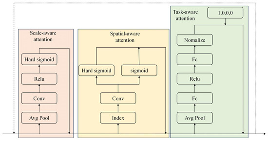 Compared to coarse localization, fine localization reduces interference significantly. However, in actual fine localization scenarios, there are still interferences such as changes in lighting or occlusion, which increase the difficulty of model detection. Inspired by the “dynamic head” algorithm proposed by Microsoft, a dynamic detection head module, as shown in Figure 6, is added to the YOLOv5s design [18] in this paper.
