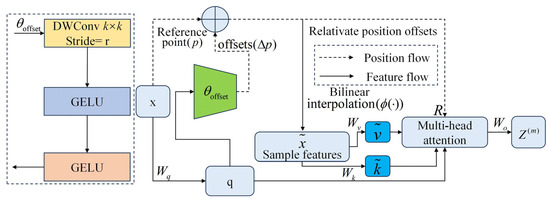 - Xia, Z.F.; Pan, X.R.; Song, S.J.; Li, L.E.; Huang, G. Vision transformer with deformable attention. In Proceedings of the 2022 IEEE/CVF Conference on Computer Vision and Pattern Recognition, New Orleans, LA, USA, 18–24 June 2022; pp. 4784–4793. [Google Scholar] [CrossRef]
