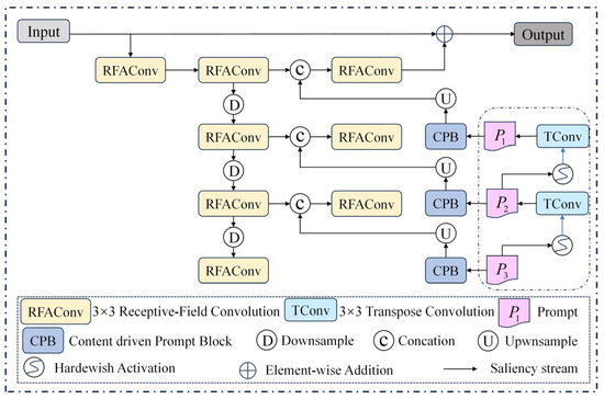 From the figure, it can be seen that the model begins to focus on the key feature points of the object. In order to improve the adaptability of the model to different working environments, the Chain-of-Thought Prompted Adaptive Enhancer Network (CPA-Enhancer) [20] is designed to improve the detection accuracy of the model in different environments. The network structure is shown in Figure 8. The network can automatically adjust the enhancement strategy according to the low-light conditions of the image, ensuring that key features can be effectively extracted in different lighting environments. At the same time, the cooperation of multiple enhancement modules in the network can enable the network to optimize processing for different types of features, enhance the details and color features of the target, effectively filter background noise, and maintain the integrity of important target information. Therefore, the network can achieve clear recognition in complex environments and significantly improve the model’s detection capabilities in complex scenes, thereby ensuring its good robustness.
