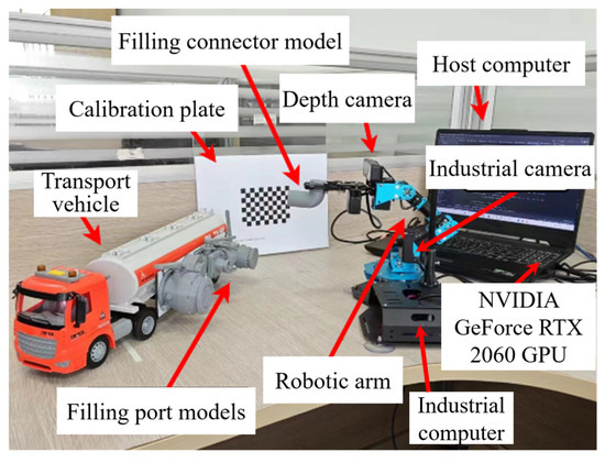 In order to verify the effectiveness of the proposed target hybrid recognition and localization method in complex scenes, a visual experimental platform is constructed as shown in Figure 9. In the experimental environment, there is an ArmPi robotic arm produced by Huaner Technology Company, a host computer, an industrial computer, an industrial camera (eye-to-hand), a depth camera (eye-in-hand), a calibration board, a filling connector model, a transport vehicle model, and several filling port models. The ArmPi robotic arm is equipped with an ARM architecture Raspberry Pi 4B motherboard, which supports 5 GHz wireless WIFI. The industrial camera is mounted on the side of the robotic arm through a bracket to obtain coarse localization information. The OAK depth camera is installed at the end of the robotic arm to obtain fine localization information. The host computer is a laptop with Windows 10 operating system, Intel i7-13700k CPU, and NVIDIA GeForce RTX 2060 GPU. The compilation environment for the target hybrid recognition and localization model is Python 3.9.17 + Pytorch 2.0.1 + CUDA 11.7. First, the host computer connects to the hotspot of the robotic arm control system and establishes a UDP communication protocol. Then, the obtained target coordinate information is transmitted to the control system of the robotic arm to drive its subsequent movement.