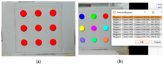 First, a calibration board is prepared with nine circles of the same size and spacing between each pair. Then, an image of the calibration plate containing nine circles is taken using an industrial camera. After that, the image is imported into Halcon software version 20.11 and converted into a grayscale image for recognition. Finally, nine circles and their corresponding pixel coordinates are extracted using image segmentation methods. The recognition results for circular features are shown in Figure 10a, and the pixel coordinate localization results are shown in Figure 10b.