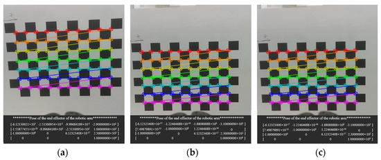 Extraction of corner points and reading of end pose of robotic arm: (a) Calibration round 1; (b) Calibration round 2; (c) Calibration round 3.