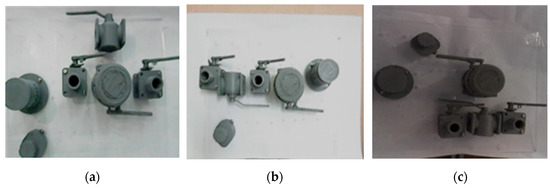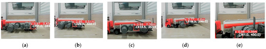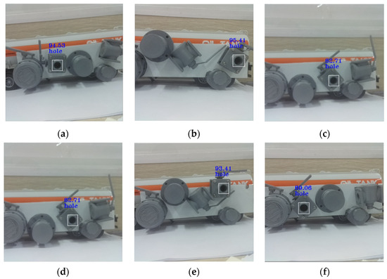 During the recognition experiment, the filling ports are randomly placed on the side panel of the oil tanker, with a total of five groups: A, B, C, D, and E. The distance between the filling port in each group and the industrial camera is controlled between 30–60 cm. During filming, the filling ports in each group are randomly tilted at a certain angle. Each group is photographed with 20 images, and a total of 100 images are obtained. The recognition results based on the improved model are shown in Figure 13.