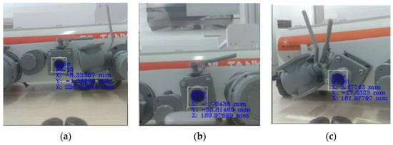 In order to test the accuracy of coarse localization of the filling port, some coarse localization experiments and their analysis are carried out. Due to limitations in the length and degrees of freedom of the robotic arm in the experimental platform, the distance between the filling port model and the robotic arm base is set to 30–40 cm. There are a total of five testing environments, and the placement of the filling ports in each group is different. After the camera recognizes the filling port, the robotic arm receives coordinate information and performs coarse localization. The coarse localization effect is shown in Figure 14.