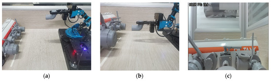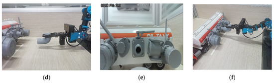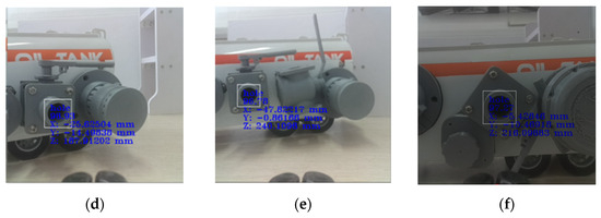 Figure 17a shows the initial position of the robotic arm before docking. After obtaining the position of the filling port, the coarse localization model transmits the coordinate information to the robotic arm control system, and then the robotic arm performs automatic coarse localization. Figure 17b shows the position after coarse localization. Figure 17c shows that the robotic arm starts fine localization after the coarse localization is completed. In order to enable the depth camera to recognize the filling port, the robotic arm moves down a certain distance so that the filling port appears completely in the depth camera image. Figure 17d shows the pose adjustment of robotic arm. Figure 17e shows the image captured by the depth camera after the pose adjustment is completed. After the fine localization is completed, the robotic arm finally completes the docking of the filling port, as shown in Figure 17f.