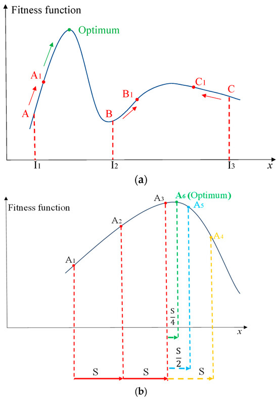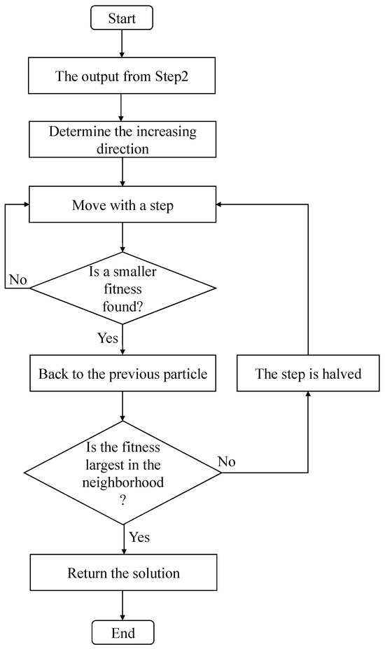 Figure 2. It first determines the increasing direction by calculating the fitness in the neighborhood of the initial value. Second, it moves to the increasing direction with an initial large step until a particle with the smaller fitness is found. Then, it backs to the previous particle and determines whether the fitness is largest in the neighborhood. If not, one half of the previous step is used to continue the process. Finally, the global best solution of