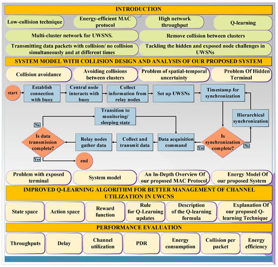 The rest of the paper is as follows: Section 2 describes the system model, with collision design and analysis of our proposed system, including collision avoidance, avoiding collisions between clusters, the problem of spatial–temporal uncertainty, the problem of hidden terminals, problems with exposed terminals, and the system model. Furthermore, Section 2 presents an in-depth overview of our proposed MAC protocol: enhancing network efficiency and performance. Section 3 presents an improved Q-learning algorithm for better management of channel utilization in UWCNs. Section 4 briefly describes a performance evaluation, including simulation design, performance metrics, and results evaluation, as well as a comparison with recent and advanced MAC protocols, while the last section is the Conclusions.