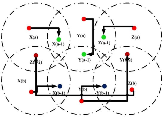 Slots of time are allotted to enable effective communication inside the cluster, although at the cost of decreased energy efficiency, in order to ensure connection between the head communicating node of the cluster and communicating nodes inside the cell region. Energy is regulated as well and time frames are provided for control reasons in order to enable efficient communication inside the cluster and create a connection between the cluster’s central node and the nodes that make up the cluster in each cell region. But when two neighboring cell regions (in the horizontal position or the vertical position) interact at the same time, collisions could happen. Figure 2 demonstrates a scenario of clusters colliding. When both CHs of the network, X(a) and Y(a), communicate with the communicating nodes X(a − 1) and Y(a − 1), accordingly, inside neighboring clusters, it is apparent from the scenario that horizontal collisions could take place.