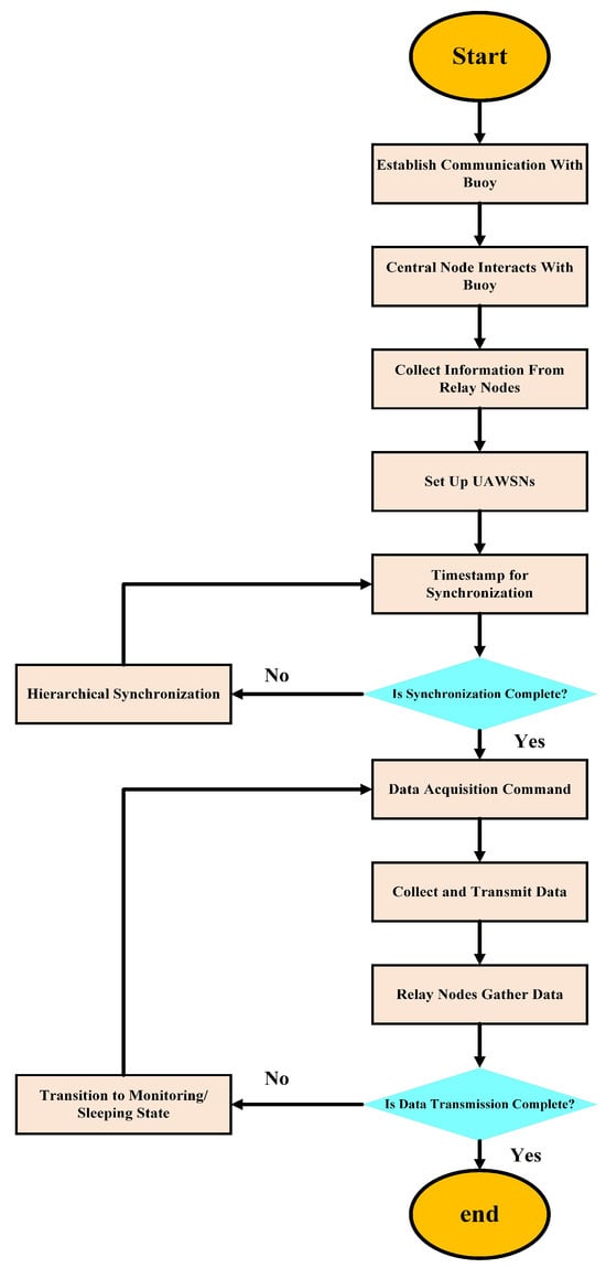 We elaborate the details of our proposed MAC protocol in Figure 6, which illustrates the complete process in a step-by-step manner. Communication is initiated from the terrestrial base station to the buoy via satellite or another communication vessel. Each layer also consists of one central node located slightly below the buoy. It interacts with these vertical central nodes to collect data and feedback from the buoy. Moreover, every central node is in charge of collecting data from all relay nodes in the same layer. Then, the relay nodes gather data from other sensor nodes, which are the ordinary sensor nodes, organized into clusters. After the establishment of the UWCN, the terrestrial base station gives a standard time for synchronization. Synchronization is achieved by a scheme of layers: buoy–center relay–ordinary nodes.