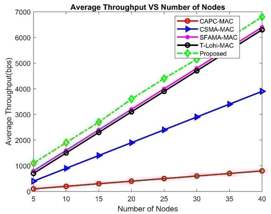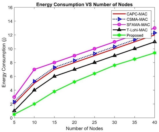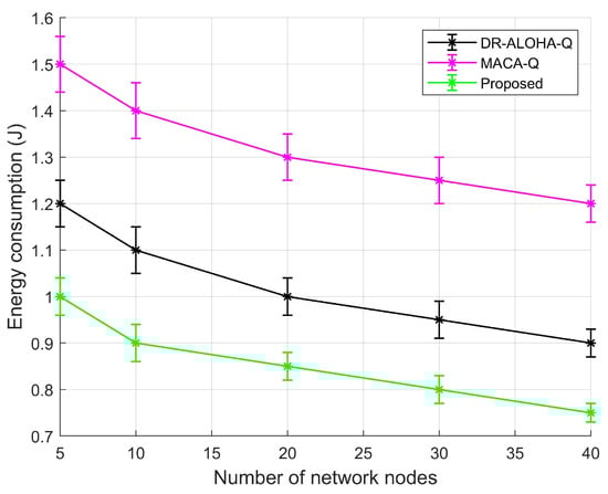 In the case of UWSNs, energy consumption is a very important issue, because it is difficult to recharge or replace batteries underwater. Our proposed system demonstrates significant improvements in energy efficiency compared to the existing DR-ALOHA-Q and MACA-Q protocols, as evidenced by Figure 25. Our proposed system consistently exhibits the lowest energy consumption across all network sizes, ranging from 5 to 40 nodes.