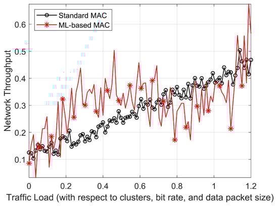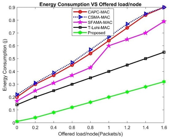 Concerning energy consumption and offering load per node packet per second, our novel Q-learning method for UWCNs has shown impressive performance gains over current MAC protocols, as shown in Figure 20. Through the clever modification of transmission parameters, the Q-learning algorithm integrated into the MAC layer is essential for dynamically optimizing energy usage. The entire network lifespan is increased as a result of this flexibility, which guarantees that the underwater sensor nodes are more energy efficient. Apart from its excellent energy management, our Q-learning method performs very well in terms of offer load per node packet per second, which is an important parameter to evaluate the network’s communication efficiency. Because of its learning capabilities, the system can optimize packet transmission rates per node and distribute resources dynamically. As a consequence, the communication burden is distributed more evenly and effectively across the network, reducing congestion and increasing throughput overall. Our Q-learning technique consistently outperforms competitors in comparative evaluations with current MAC protocols, providing a comprehensive solution that guarantees a more equitable and efficient use of network resources per node packet per second in UWCNs, while also optimizing energy consumption.