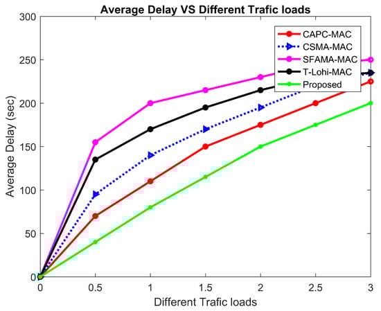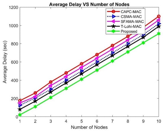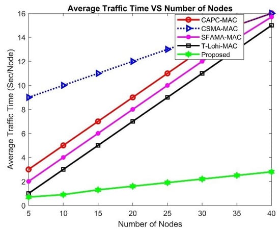 Here, we compare our proposed MAC protocol with the very recently proposed MAC protocols for UWSNs and UAWCNs. Our proposed system demonstrates superior performance compared to the existing DR-ALOHA-Q [60] and MACA-Q protocols. This superiority can be attributed to several key factors that enhance channel utilization and overall network efficiency. Firstly, our proposed system achieves consistently higher channel utilization, as evidenced by the green line in Figure 23. This indicates that our protocol can handle more data traffic and make better use of available bandwidth, which is critical in the bandwidth-constrained underwater environment. The higher channel utilization means that more data packets are successfully transmitted without collisions, leading to more efficient use of network resources.