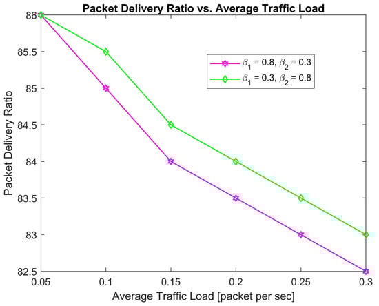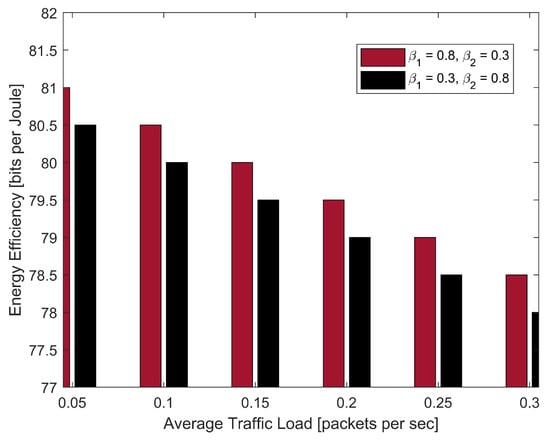 The network’s energy efficiency, as shown in Figure 21, shows a steady decline as the average traffic load increases, supporting the pattern seen in Figure 16 regarding the PDR. Notably, energy efficiency is mostly determined by the interaction between the weighting factors and . In particular, the network achieves better energy efficiency when is less than , indicating a stronger focus on the energy-efficient reward element specified by as opposed to collision avoidance, . This suggests that with these parameter values, the system gives energy conservation a higher priority than collision avoidance, which leads to a more effective use of network resources when traffic load fluctuates. The results highlight how important parameter adjustment is to achieve a balance between the competing goals of energy efficiency and network collision avoidance.