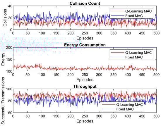 The results described in Figure 22 show the performance of the proposed Q-learning-based MAC protocol and a fixed MAC protocol from episode 1 to episode 500 in underwater wireless sensor networks (UWSNs). From the collision count graph, it can be observed that Q-learning MAC always has a much lower collision count than fixed MAC, proving the low-collision-rate capability of this protocol. The Q-learning MAC protocol shows lower energy consumption in the energy consumption graph Figure 22, which results from the versatility to vary the transmission energy, unlike the fixed MAC protocol that has incessant higher energy use. Last but not least, through the throughput graph it can be observed that the Q-learning MAC protocol has better success rates of successful transmission and shows more stability in its number of successful transmissions as compared to the DCF MAC protocol, thus demonstrating the ability of the Q-learning MAC protocol to learn and adapt to the network environment in order to achieve optimum solutions for the data transmission. Overall, the Q-learning MAC protocol outperforms the fixed MAC protocol in all three key metrics: A bull’s-eye scatter plot of the collision rate in terms of energy efficiency and throughput is also shown.
