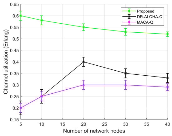 The ability to quickly adapt and maintain high performance ensures that the network remains functional and efficient despite varying underwater conditions. Furthermore, our proposed system demonstrates a clear advantage over the existing DR-ALOHA-Q and MACA-Q protocols in terms of channel utilization, as shown in Figure 24. This superiority is evident across various numbers of network nodes, highlighting the robustness and efficiency of our approach. Our proposed system consistently achieves higher channel utilization, maintaining values above 0.55 Erlang even as the number of network nodes increases from 5 to 40. This indicates that our protocol efficiently manages network traffic and minimizes collisions, which is critical in the bandwidth-limited underwater environment. High channel utilization ensures that the network can support more data transmission activities simultaneously, enhancing overall communication efficiency. In comparison, the DR-ALOHA-Q protocol shows a peak in channel utilization at around 20 nodes but then experiences a decline as the number of nodes increases. This suggests that DR-ALOHA-Q may suffer from increased contention and collisions as the network density grows, leading to inefficiencies. The MACA-Q protocol performs even worse, with consistently lower channel utilization values, peaking around 20 nodes but failing to sustain high performance with further increases in network size.