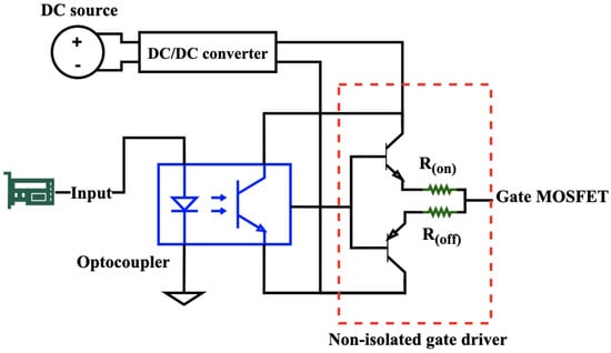 Because the HV H-bridge circuits’ reference potentials are switching with the output voltage, high isolation is required between the H-bridge and the control circuit. This isolation concerns the gate signals, gate driver supply voltages, and optional feedback signals such as measurements or status signals. Optical signal isolation is one of the feasible choices for the considered output voltage levels, either using a high-isolation optocoupler or fiber optics. The rest of the gate drive circuitry must only withstand the voltages inside one H-bridge stage. This concept is shown schematically in Figure 2, where the non-isolated gate driver circled by red is implemented using a BJT push–pull stage with a split output and the isolation barrier is shifted towards the optocoupler and isolated DC/DC converter. Compared to the core-isolation method [10,11], the optical-isolation method excels in its superior high-voltage performance, faster signal transmission and response, reduced electromagnetic interface, and enhanced safety and reliability.