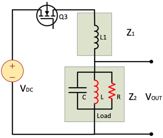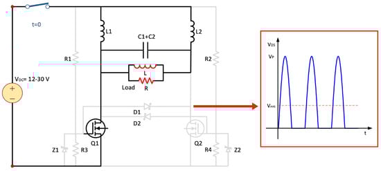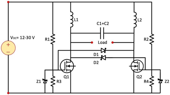 The ZVS driver is self-oscillating if sufficient input voltage is applied. As the driving circuit starts, one of the MOSFETs is turned on first due to the resistance tolerance range variation in the divider resistors and the difference in MOSFET gate threshold voltages. According to Figure 3, if rises faster than , reaches its threshold voltage earlier and is triggered faster. Then, reduces and the charges flow through the Schottky diode instead of the gate of MOSFET . As a result, is pulled low and becomes larger. Therefore, remains off. Due to the LCR resonant circuit shown in Figure 4, at a particular instant, will also be pulled low. The charges will then flow through . Conversely, will be pulled low and will be switched off, resulting in an increase in . will be switched off and the charges will be added to the gate of through the voltage divider. Thus, rises and will be triggered, and the oscillation continues.