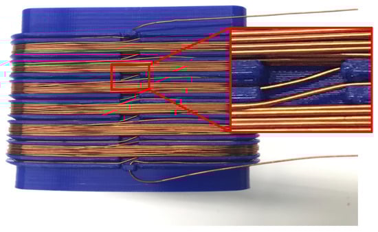 For the MFT secondary winding, every disc segment is expected to handle around 1.5 kV. In total, six discs should be provided (to satisfy the desired ). Moreover, as seen in Figure 6, an isolation turn is introduced between adjacent winding discs to avoid disc-to-disc discharges. By wrapping this isolation turn around the bobbin, it separates the adjacent discs and makes sure that the last turn of the upper disc segment does not touch all the other layers of the adjacent lower disc segment. The designed bobbin has rounded corners and sufficient disc-to-disc creepage distance to prevent flashovers.