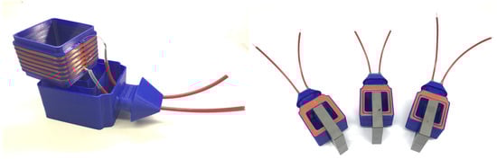 The measured inductance of the primary winding is 106 µH with core (). The internal capacitance and inductance of the ZVS driver are 0.6 µF (C) and 98 µH (), resulting in a transformer working frequency of around 28 kHz according to (7).