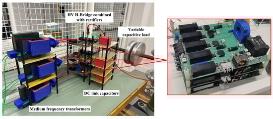 Figure 8 illustrates the non-breakdown experimental configuration of the three-stage CHB-based HV-AWG. The setup includes a 10 kV MFT that provides galvanic isolation between primary and secondary sides. The output voltage from the MFT is subsequently rectified by the 6 kV, 1 A rectifiers and then stabilized using a 3 kV, 1.0 µF capacitor. This stabilized voltage is then supplied to a series of cascaded HV H-bridge modules, which are responsible for synthesizing the desired arbitrary waveforms.