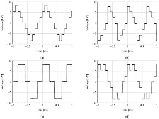 Customized output waveforms of the 3-stage modular CHB-based HV-AWG. For waveform (c), three H-bridge stages are controlled as a single stage. (a) Triangular staircase waveform. (b) Sawtooth-shape staircase waveform. (c) Three-level square waveform. (d) Complex-shape staircase waveform.