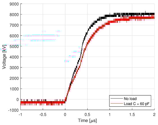 For each individual HV H-bridge module, with a total load of 60 pF (including 20 pF for the measuring probe), the voltage applied to the test object can be increased to ± 3.2 kV. As shown in Figure 11, the rise and fall times of the HV H-bridge are approximately 800 ns (without ), resulting in a maximum current peak adjacent to, but less than 0.6 A. Therefore, the H-bridge validation voltage is limited to 3.2 kV. Exceeding this voltage during switching transients causes the current to surpass the , potentially damaging the MOSFET layout.