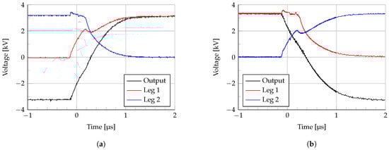 Output and phase leg waveforms for one H-bridge with 3.2 kV DC voltage and 80 pF load (60 pF for and 20 pF for ). (a) HV H-bridge output voltage rise duration; (b) HV H-bridge output voltage fall duration.