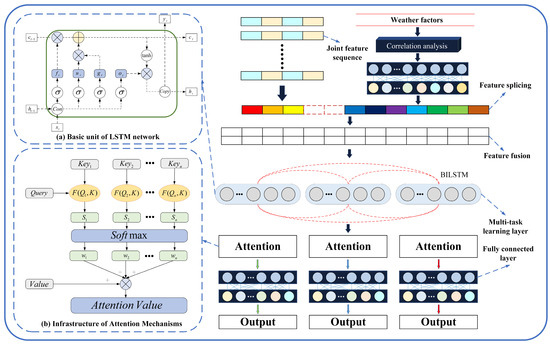 Accompanied by the accelerated evolution of integrated energy systems, single-load forecasting has increasingly given way to multivariate load forecasting in the study of load forecasting. At present, multivariate load forecasting mainly focuses on deterministic forecasting, which can be categorized into two types according to the number of model research objects. The first category is the separate prediction of multivariate loads, which uses single-task-learning (STL) models to establish independent prediction models for multiple loads, like electricity, heating, and cooling, respectively, and the models are unrelated. Ref. [23] decomposed the data by aggregated modal decomposition and then used a temporal convolutional network (TCN) for prediction. Ref. [24] incorporated a dual attention mechanism into the Seq2Seq model, improving the algorithm’s ability to learn temporal and input features. The methods above improve the prediction accuracy of STL models by introducing the attention mechanism or modal decomposition. However, since the STL models are independent, they cannot fully consider the coupling characteristics between multivariate loads. This independence restricts the model from capturing and synthesizing the interactions between loads, which may affect the overall forecasting effect.