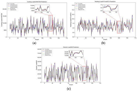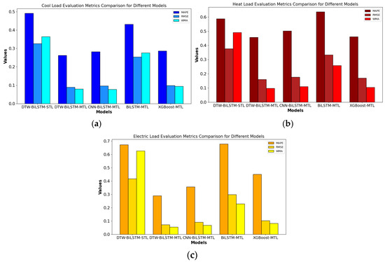 Comparison of multivariate load forecasting accuracy based on different models. (a) Cool load; (b) heat load; (c) electric load.
