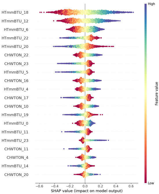 Figure 7 illustrates the top 20 metrics with the largest impacts on multivariate loads between 1 January 2023 and 31 December 2023. The heat load metrics have the greatest impact, with most metrics impacting both directions. There is a significant impact between different load indicators, which verifies the impact of the tight coupling between different load indicators on the forecast accuracy. Meanwhile, comparing the rankings in Figure 7 to the relevant rankings in Figure 4 can prove the indicator’s validity. In addition, when analyzing the metrics’ effects at various moments in time, the visualization of multiple time points during the forecasting period is presented in Figure 7, both in the morning and evening. The load significantly affects the forecast accuracy, and the users’ electricity consumption patterns during the morning and evening peaks and the lunch breaks tend to increase the load. In contrast, the users’ related behaviors during working hours tend to decrease the load.