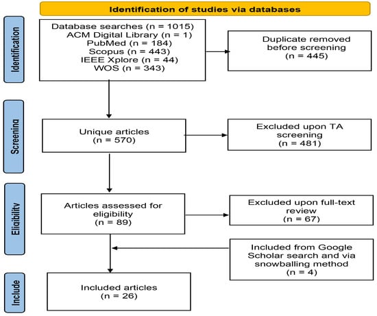 The selection process began with a title and abstract screening (TA) of 570 unique articles retrieved from the database search. The first (SE) and second (EO) authors independently conducted this initial screening to evaluate whether the title and abstract included the keywords related to health risk assessment and machine learning, as outlined in Section 2.1. Following the TA screening, 89 articles advanced to the full-text review (FTR) stage. During this phase, SE and EO independently and simultaneously evaluated each article according to the inclusion criteria shown in Table 2. Articles were first evaluated based on general inclusion criteria: (1) Written in English; (2) Peer-reviewed; (3) Published in a journal or conference. The articles meeting these criteria were then further assessed to ensure they specifically addressed health risk assessment (HRA) using machine learning techniques, which was the main inclusion criterion. Articles not directly relevant to the objectives of the systematic review were excluded, including those unrelated to chronic disease-based HRAs, even if they contain the search keywords. Ultimately, 26 articles were included in the final analysis. The first and second authors collaboratively reviewed the included articles, extracting relevant data into a Google Spreadsheet, where it was processed, charted, and tabulated. Refer to Table 3 for details of the key data items (e.g., author identification, publication year, study objectives, population, machine learning algorithms, and key findings) extracted and their definitions. Each data item was carefully selected by the authors to align with the objectives of the systematic review and best practices established in the literature [26].