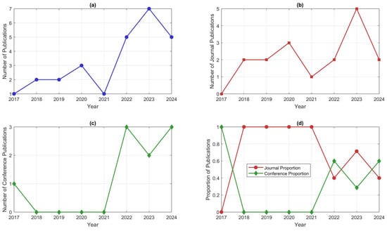 Publication distribution by year: (a) Total publications; (b) Journal publications; (c) Conference publications; (d) The proportion of journal and conference publications obtained by dividing the respective counts by the total counts.