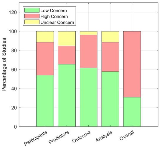 Risk of Bias Assessment: The PROBAST technique was used to assess the risk of bias of the predictive models in the included studies. As shown in Table 10, and Figure 4, fourteen of the studies (53.85%) were rated as low risk for participant selection, while nine (34.62%) were rated as high risk. For predictors, seventeen of the studies (65.38%) were classified as low risk. In the outcome assessment category, sixteen (61.54%) of the studies were considered low risk, fifteen of the studies (57.69%) were judged as low risk in the analysis domain, and eight (30.77%) were high risk. Overall, eight (30.77%) of the studies were rated as low risk [42,43,48,49,50,51,53,55], while the remaining eighteen (69.20%) were categorized as high risk.