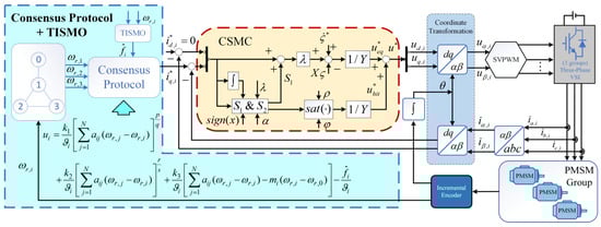 This section presents a cooperative control scheme for the coordinated speed control of multi-PMSMs based on an undirected topology graph. A fixed-time consensus protocol is designed to replace the traditional speed loop controller. Communication within the established topology structure between the PSMSs ensures that the state variables in Equation (1) converge within the fixed time. At the same time, a TISMO to estimate disturbances and compensate for the disturbance in the control protocol. The main block diagram is illustrated in Figure 2.
