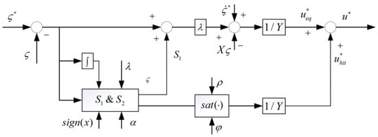 Based on ; , the system satisfies the Lyapunov stability conditions, ensuring that the state trajectory from any position can reach the boundary layer within a finite time and eventually reach the sliding surface, thereby guaranteeing the stability of the system [28]. The schematic diagram of the CSMC is illustrated in Figure 3.