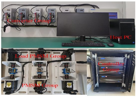 Comparative experiments are conducted with the traditional DCC method on the semi-physical simulation experimental platform shown in Figure 4. The experimental platform includes a host computer, three controllers, three PMSM drivers, three load PMSM drivers, three PMSMs, and three load PMSMs. The host computer sends control signals to the three controllers, and the controller applies control algorithms to the three PMSM drivers and three load PMSM drivers to drive the PMSM to rotate. The three controllers form a local area network with the host computer through a switch and transmit data through the user datagram protocol (UDP). Table 1 presents the PMSM parameters on the experimental platform. Table 2 presents the parameters of the traditional DCC method and the new control method proposed in this paper.