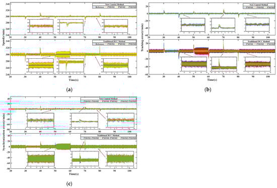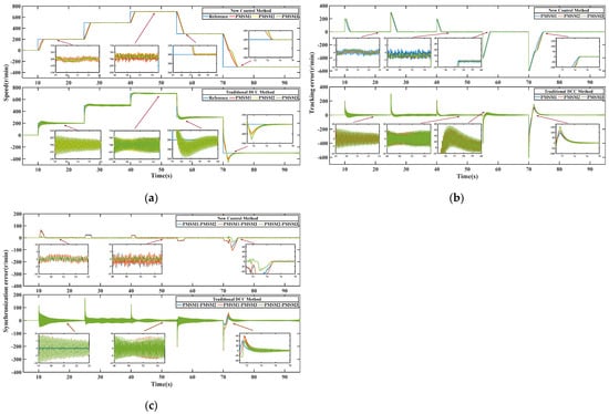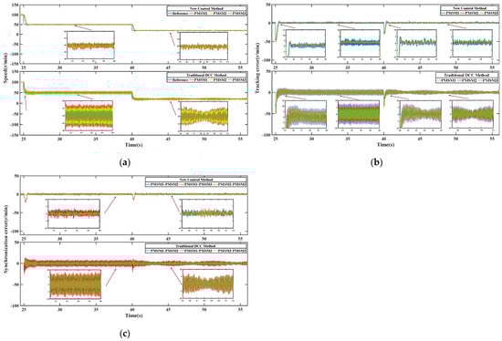 Comparative experimental results of load addition and reduction. (a) Comparative curve of speed response. (b) Comparative curve of speed tracking error. (c) Comparative curve of speed synchronization error.