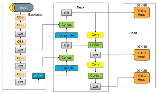 In summary, YOLOv8 builds upon the rapid detection and high-precision characteristics of the YOLO series, further enhancing its versatility and practicality by optimizing network architecture and introducing new technologies. As the field of computer vision continues to evolve, the application prospects of YOLOv8 in areas such as intelligent transportation and security monitoring are poised to expand significantly, providing robust support and solutions for the realization of intelligent scenarios. The following section illustrates the network architecture of YOLOv8 (see Figure 1).